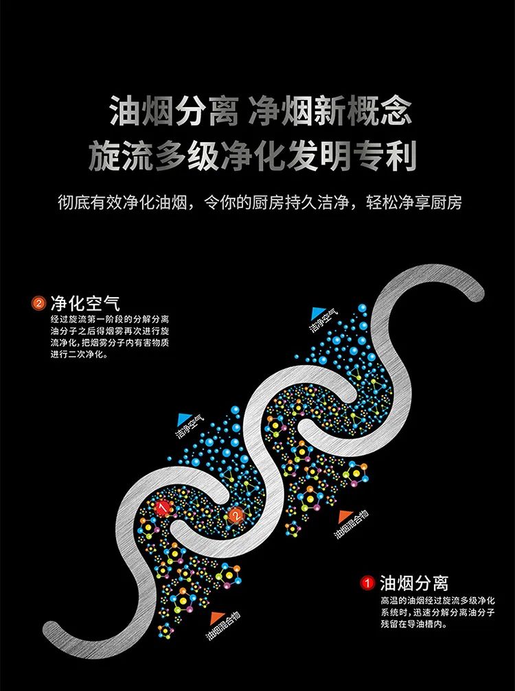净烟新概念,旋流多级净化油烟分离专利技术,油烟分离净化空气,让厨房持久洁净,从此告别油污,避免油烟带来的健康隐患。